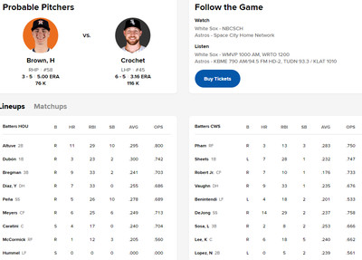 The Astros need to get going, and this series against the White Sox looked like a good place to start. But they lost last night and tonight they face the Sox ace, Garrett Crochet.